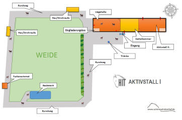 Im Oktober 2012 haben wir unseren ersten Aktivstall eröffnet. Mit fast 400m Wegstrecke im Rundweg bietet der Aktivstall I. jedem Pferd genügend Freiraum in der Herde. Wegpunkte, wie der Badeteich, der Kraftfutterautomat oder die Tränke bieten Anreize und im Sommer die Weide reichlich Platz zum Spielen mit den Freunden. Aktivstall I. ist ebenso wie der im November 2014 eröffnete Aktivstall II. mit einer großen Liegehalle verbunden in den sich die Pferde aufhalten können. Die Liegehalle selbst umfasst zwei Ein- und Ausgänge, sowie gerundete Ecken, damit kein Pferd in die Enge getrieben werden kann. Jeder Aktivstall fasst 20 Pferde und bietet auch dem Reiter ausreichend Platz in der großen Sattelkammer.
